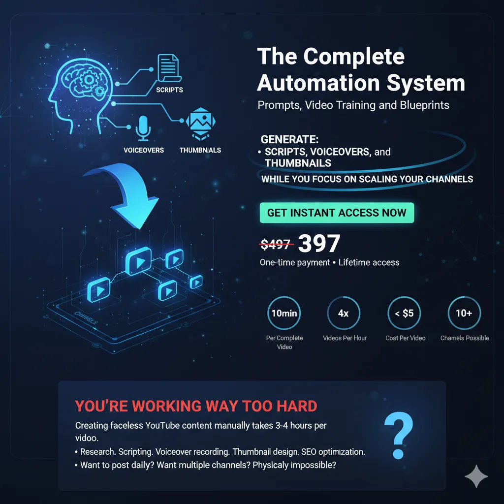 The complete automation system with prompts, video training, and blueprints that generates scripts, voiceovers, and thumbnails while you focus on scaling your channels